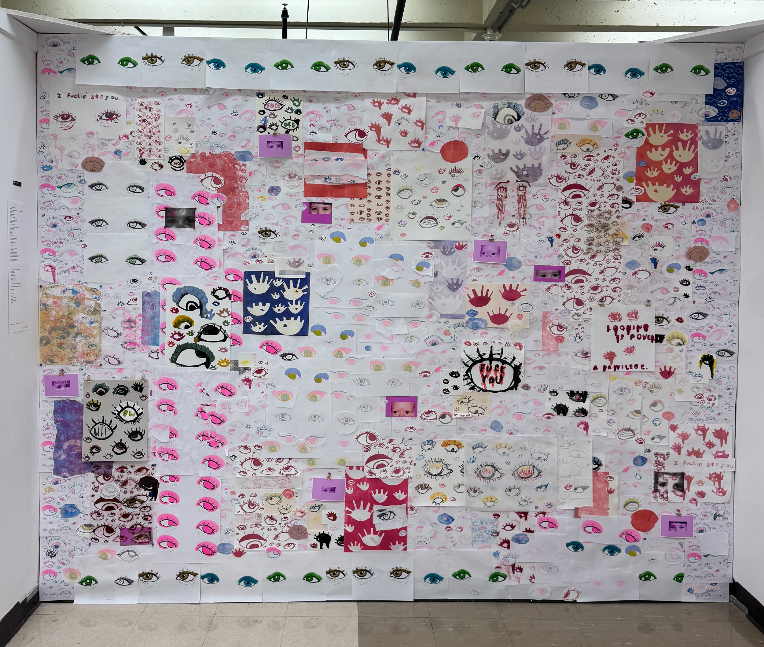 print installation—prints and print materials (risographs, serigraphs, monoprints, relief prints, photographs, photographic inkjet films, hand drawn serigraph transparency), tape, glue, push pins, map pins, binder clips